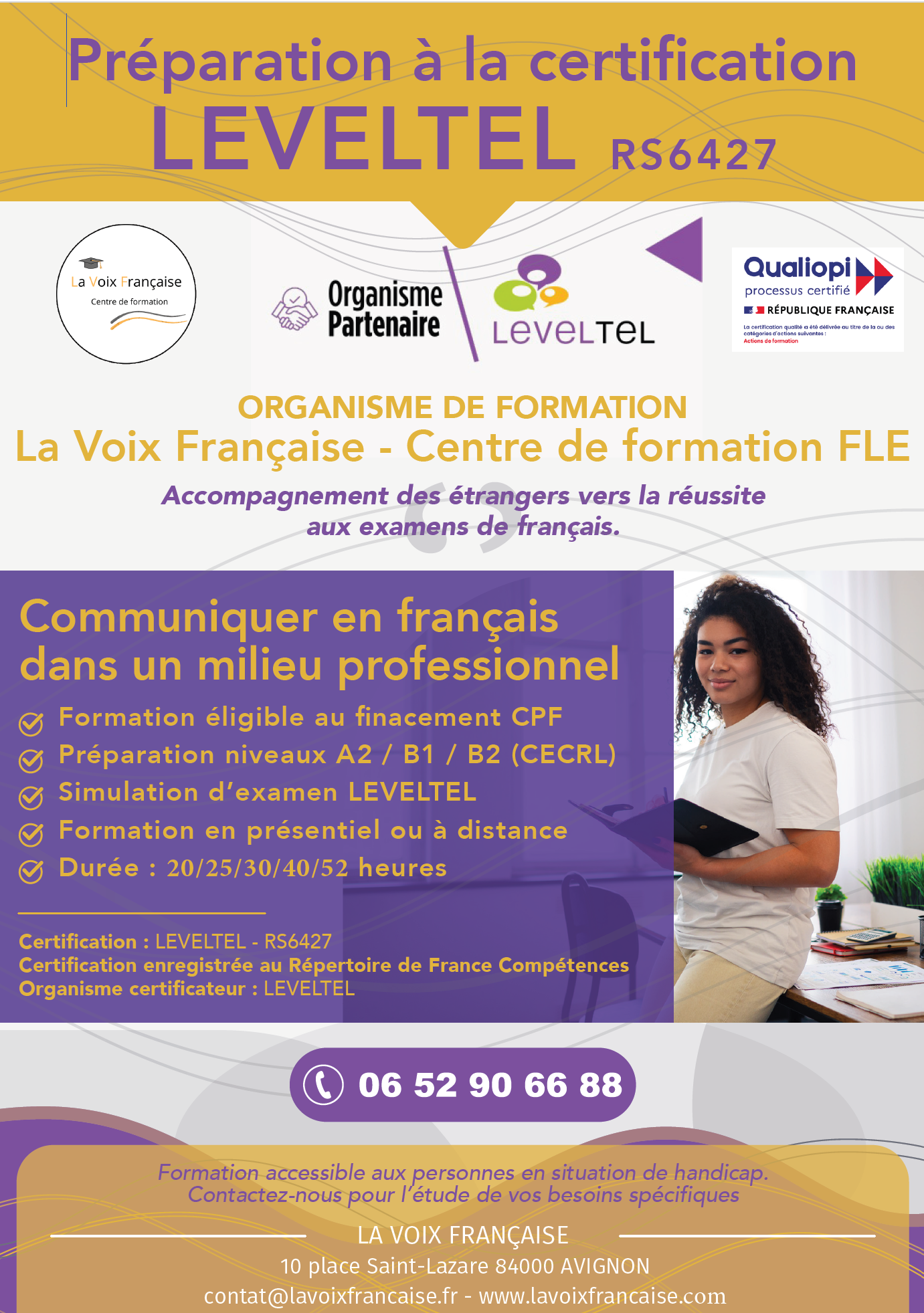 La Voix Française est un centre spécialisé dans la préparation aux examens officiels de français pour les apprenants étrangers. Nous proposons des cours structurés et ciblés pour les niveaux A2, B1 et B2, adaptés aux exigences des certifications linguistiques. Nos formateurs qualifiés, experts en didactique du Français Langue Étrangère, assurent un accompagnement personnalisé en présentiel afin de maximiser vos chances de réussite. Pour répondre aux besoins de chacun, nous proposons exclusivement des cours en soirée et le week-end.